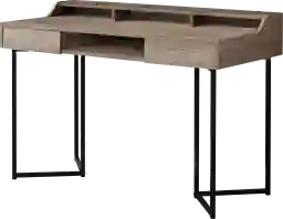 This modern style Cotulla computer desk packs a lot of storage options in one sleek compact design. The spacious table top, made from durable material, is finished in a dark taupe wood-grain look on all sides with ample room for a laptop, lamp, office supplies along with three open cubbies and a top shelf for your easy to reach essentials. There are two seamless storage drawers with a push-in mechanism and an open concept shelf in the middle to store a tablet, books, or magazines. The desk finishes off with bold angular black metal legs for a light contemporary feel. Place this space saving desk in any room for instant style with maximum functionality! Customer assembly is required.