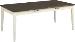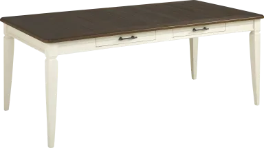Perfect for serving any meal, the Country Lane dining table is an inviting gathering place. The 40 x 78-inch rectangle top is finished in a rich brown while the apron and legs boast an antique white color. Four storage drawers provide a handy spot for utensils, napkins and more.