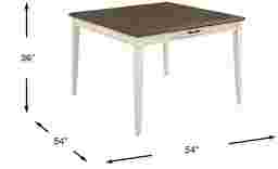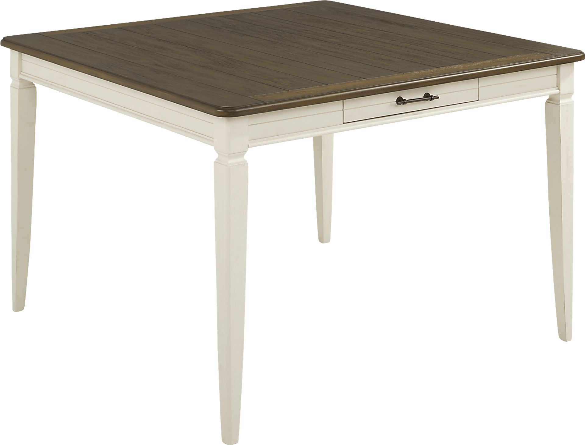 Ideal for enjoying any meal, the Country Lane counter height dining table is an inviting gathering place. The 54-inch square top is finished in a rich brown while the apron and tapered legs boast an antique white color. Two built-in drawers offer convenient storage at your fingertips.