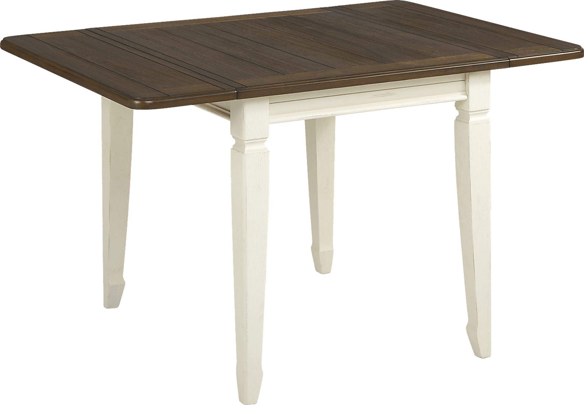 For cottage style charm and versatility look no further than the Country Lane dining table. This 30 x 36-inch drop leaf table has two 10-inch leaves on each side allowing it to be extended to 40-inches long or 50-inches long x 36-inches wide. The top has a rich brown finish while the apron and legs offer support in a contrasting antique white color.