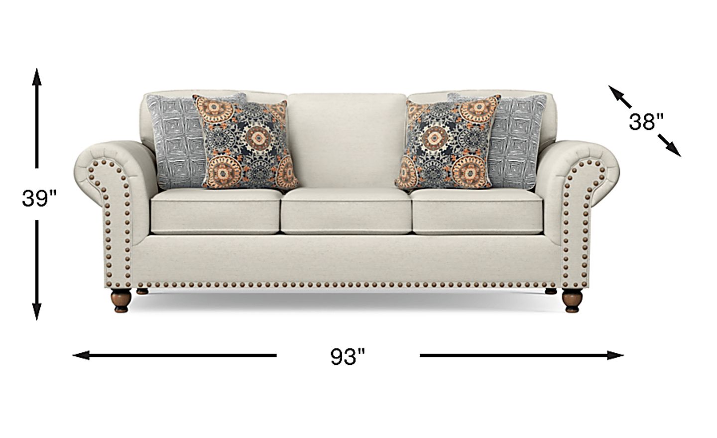 Chic transitional style, comfort and versatility blend beautifully on the Court Street sleeper. It features tailored details and a sophisticated silhouette created by pleated rolled arms, nailhead trim, welted seams and turned legs in a rich brown finish. The sofa's beige colored woven fabric offers a neutral backdrop for the designer-inspired medallion and diamond patterned accent pillows. Tucked away and easily pulled out for overnight guests, the sleeper boasts a queen sized Nature's Bed Reflection mattress with gel foam comfort. Reversible back and seat cushions extend the life of the sofa adding overall value to the stylish aesthetic. 100% Polyproylene.