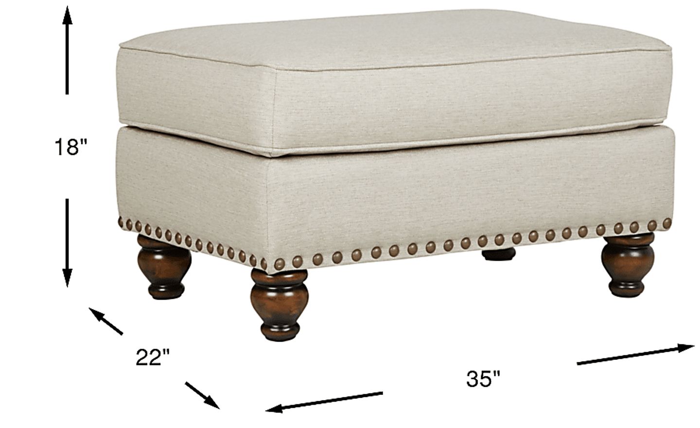 The Court Street ottoman provides the perfect spot for tired feet as well as an extra seat. This stylish piece, upholstered in beige colored woven fabric, features a cushion with welted seams. Decorative nailheads enhance the base while turned legs in a rich brown finish offer support. 100% Polyproylene.