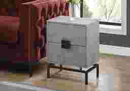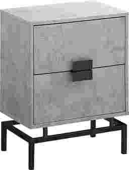 This retro inspired Cove Points side/end accent table gives a modern glamorous look to a room. Finished in a stylish laminated gray cement-look on all sides, with two large storage drawers on metal glides accented with chic black nickel metal drawer pulls that meet together as one. The bold yet simple silver black nickel metal base elevates this accent table to another dimension. Versatile to use as a nightstand for a modern bedroom or next to a sofa or chair as a side table, this is one statement making accent furniture piece. Customer assembly is required.