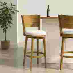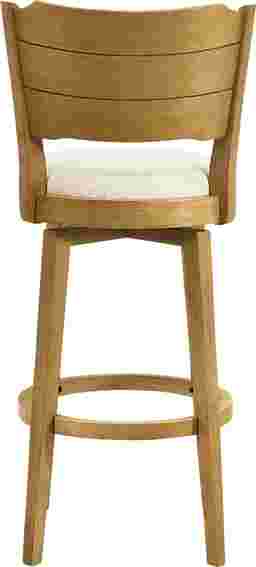 The Covencaster barstool brings timeless craftsmanship together with modern comfort, offering a versatile swivel stool that complements both classic and contemporary interiors. Defined by its sculpted ladder-back silhouette and plush boucle-upholstered seat, Covencaster captures the balance between elegance, functionality, and everyday ease. Built with a strong solid natural wood frame. This finish pairs beautifully with the white boucle performance fabric, creating a sophisticated yet inviting visual contrast. The boucle upholstery adds tactile depth and softness, while its performance-grade construction ensures resistance to stains, moisture, and fading, ideal for active homes and social spaces. The Covencaster stool's 360-degree swivel functionality allows for effortless movement, making it perfect for open-concept kitchens, dining bars, and casual gathering spaces. Its round cushioned seat provides exceptional comfort and support, while the curved ladder-style backrest adds both st