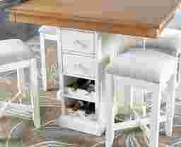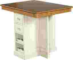 Make the most of your casual dining area with the Coventry Lane island style table. Each side of the space savvy base features two felt lined storage drawers with wood knobs as well as racks that hold up to 4 bottles of wine. The table, supported by a rubbed through cream finished base made with rubberwood solids and okume veneers, stands 36 inches high while the pine veneered table measures 44 x 32 inches.