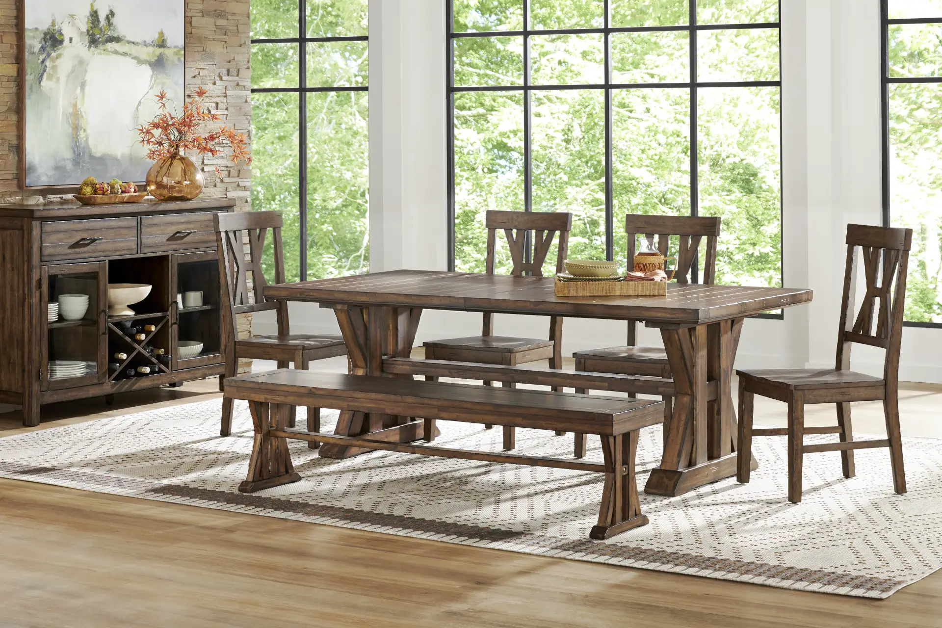 The cozy magic of an old world cottage comes to life amid the trestles of the Covered Bridge dining room, brightening mealtime with the warmth reminiscent of a blazing hearth. A richly textured 86" tabletop finished in tobacco brown extends to an impressive 126" with two included 20" leaves. The crisscrossing beams of the base are mirrored in the splat backs of each side chair. An included bench echoes the same design in its legs, adding a charming family-style seating option.