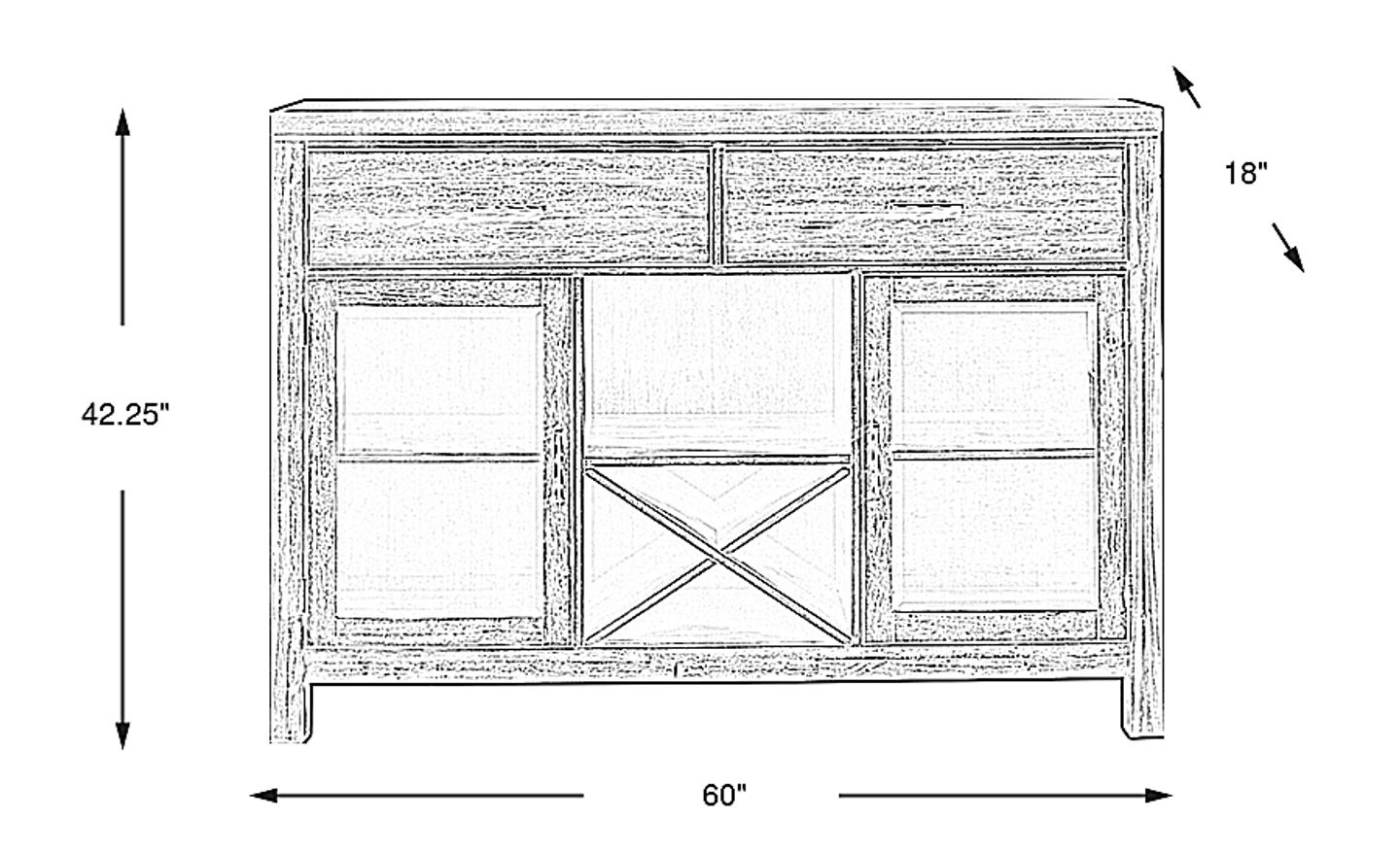 This server is designed for both organization and display. The two glass-front doors allow you to showcase fine china or glassware while keeping them protected from dust. The central X-shaped rack provides dedicated storage for wine bottles, keeping them horizontal to preserve cork moisture and wine quality. For smaller items like silverware or linens, the two upper drawers keep essentials organized and out of sight.