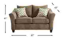 Welcoming the unhurried warmth that rises between cappuccinos and conversation, the Covington collection brings the ambiance of your favorite coffee shop to the calm comfort of home. This transitional loveseat blends classic elegance with cozy character in a mocha chenille, the soft fabric complemented by a set of warm accent pillows. Scatterback pillows and loose seat cushions invite casual relaxation, while the sweeping flare arms and welted seams throughout punctuate the look with sophisticated grace. Upholstery: 100% Polyester.