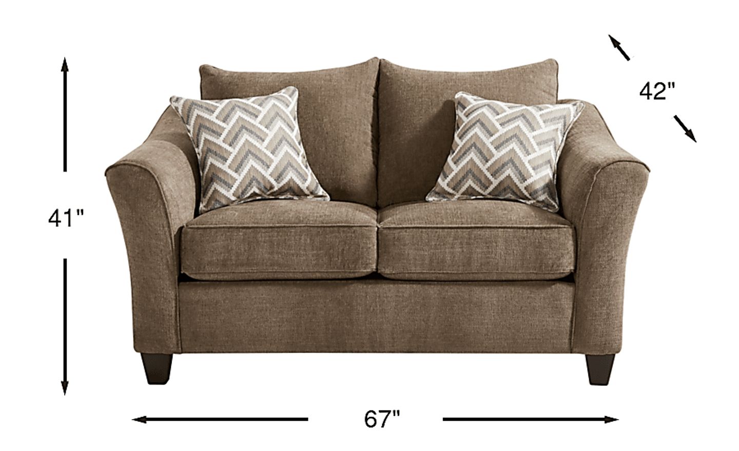The loveseat measures 67"W x 42"D x 41"H. To ensure a smooth delivery, we recommend measuring the width of your doorways and any narrow hallways or stairwells. Based on our delivery expertise, this stationary piece typically requires a clear path that can accommodate its 42-inch depth or 41-inch height to navigate tight turns.