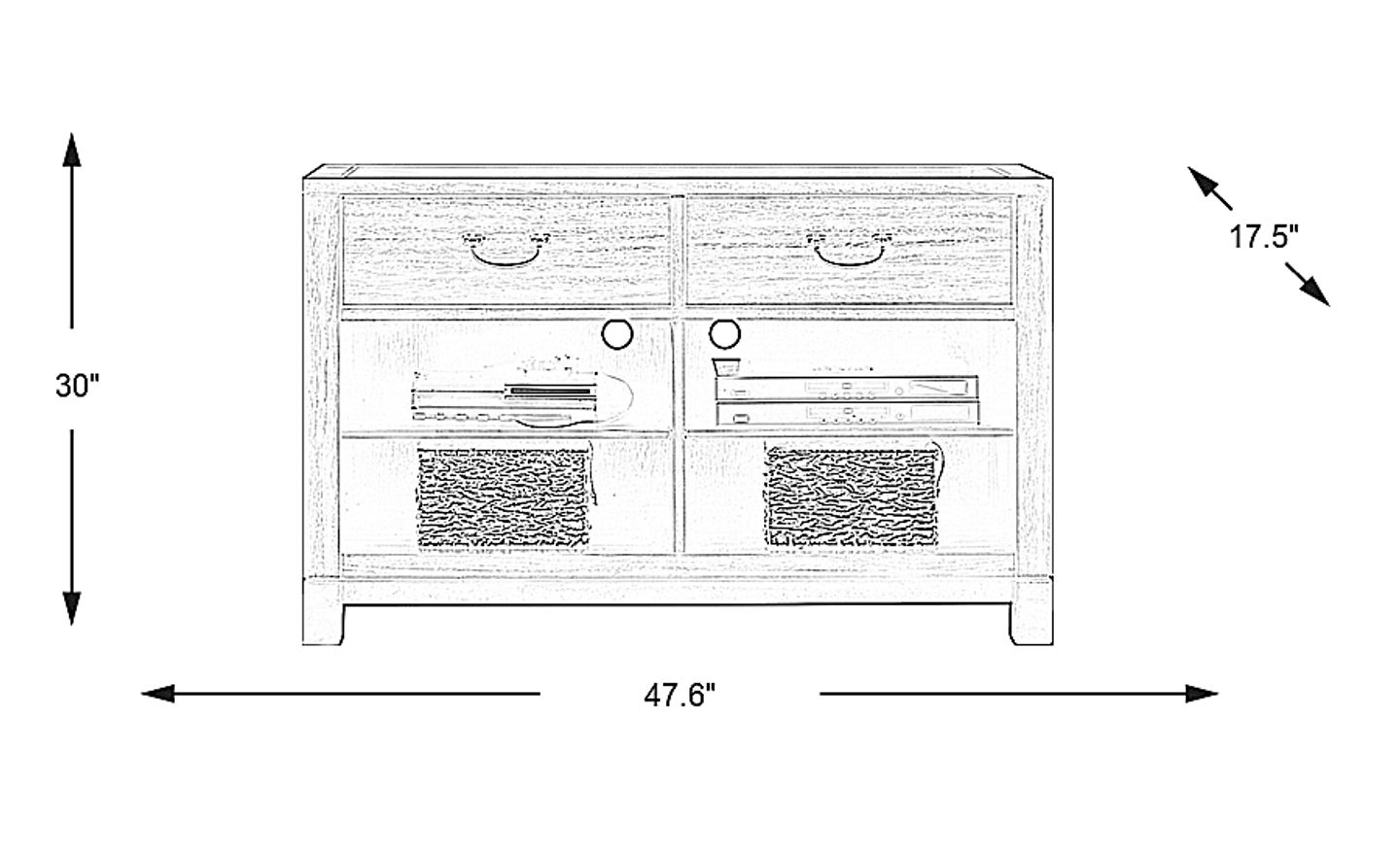 The multi-purpose Cranwell sofa table is a handy item for your living space. The 48 inch long surface space can accommodate a smaller flat screen TV while double drawers and shelves below accommodate electronics, home accents and more. Both drawers boast black finished handles. Pass through holes on the back panel keep wires tucked neatly out of view. Made with wood solids and veneers, the table has a dry brushed walnut brown finish.