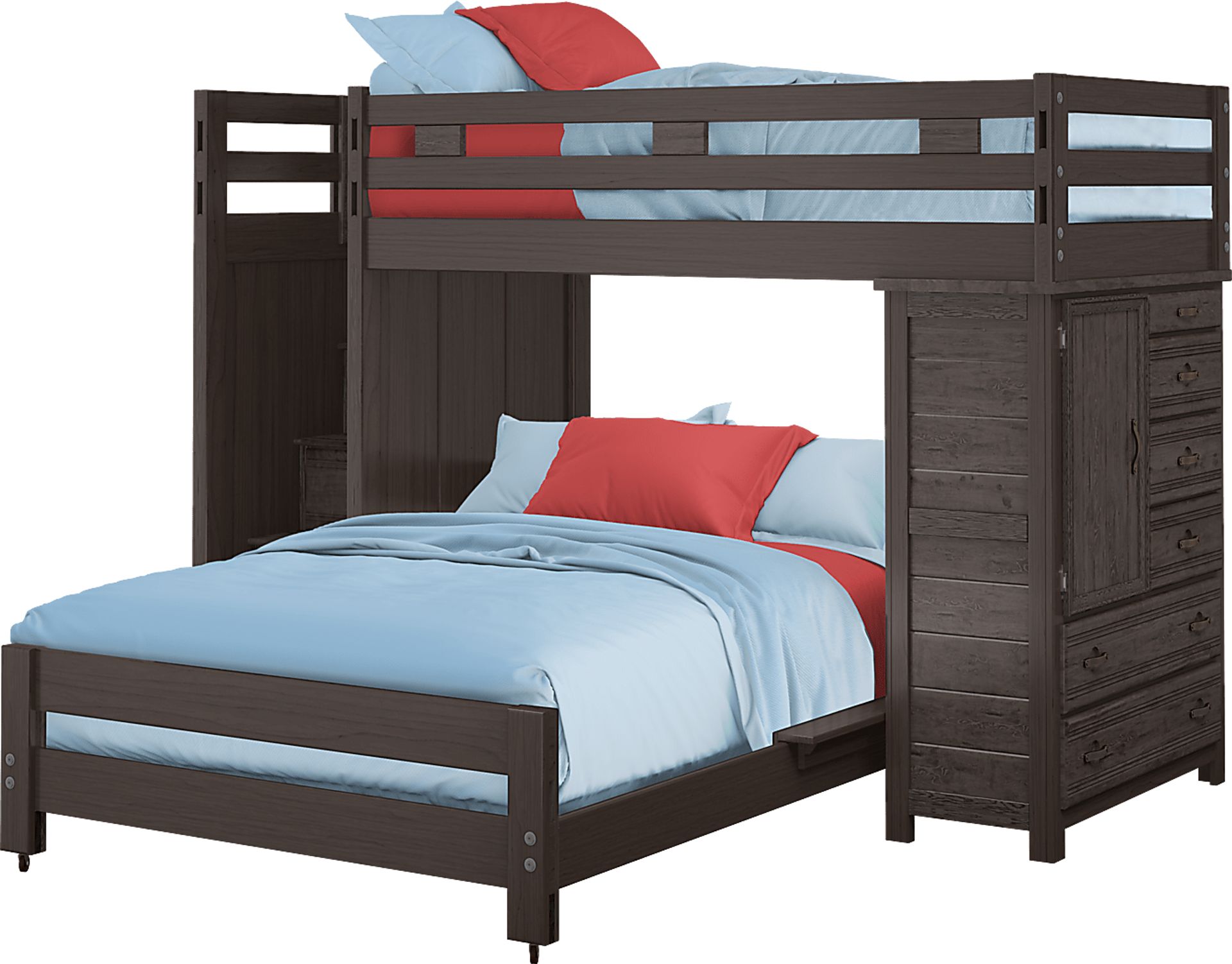 The Creekside twin/full step bunk makes the most of the space in your child's bedroom. On one side, you'll find a storage chest with six drawers and shelf space fronted by a door. The opposite side has steps that lead to a twin top bunk. Each step has skid resistant textured strips and built in storage drawers. The full bottom bed is on casters so it can be moved easily. Durable construction is achieved with pine solids and topped off with a charcoal finish. Mattresses and foundations (if required) sold separately. Bunkies required for mattress support.