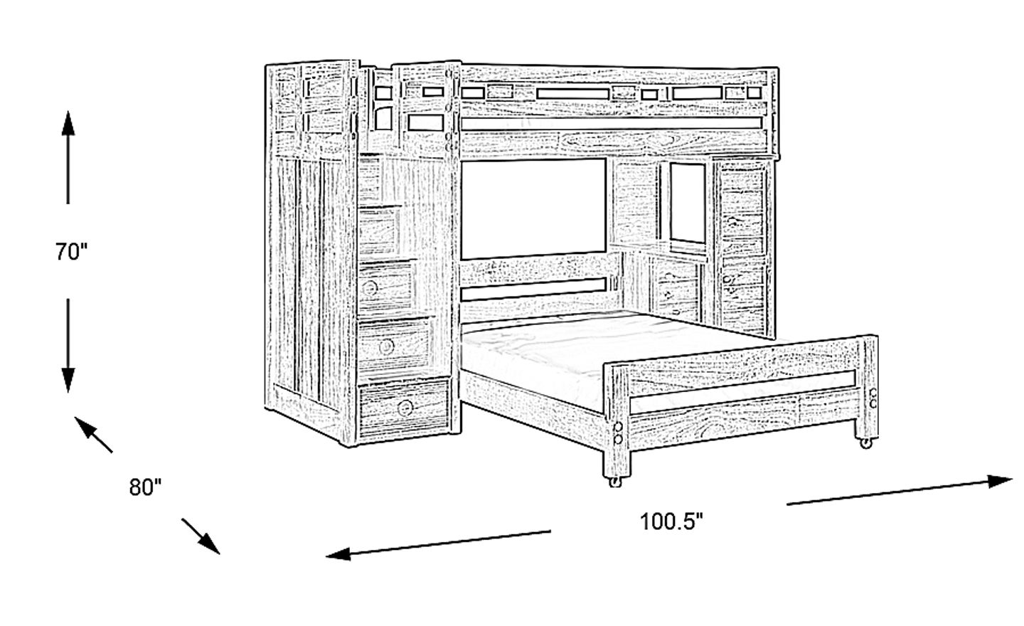 With its creative space saving features, the Creekside twin/full step bunk is a fantastic choice for your child's bedroom. One end of the loft has steps with built in storage drawers; the other end has a student desk with three side drawers. Each step has a textured strip for slip resistance. For flexibility, the bottom full bed is on casters so it can be easily moved to another part of the room. Crafted with pine solids and veneers, the charcoal finish adds a beautiful enhancement. Mattresses and foundations (if required) sold separately. Bunkie Boards required for mattress support.