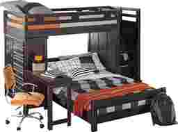 With its creative space saving features the Creekside twin/twin step bunk is a fantastic choice for your child's bedroom. One end of the loft has steps with built in storage drawers; the other end has a student desk. Each step has a textured strip for slip resistance. For flexibility, the bottom full bed is on casters so it can be easily moved to another part of the room. Crafted with pine solids, the charcoal finish adds a beautiful enhancement. Desk chair shown not available. Mattresses and foundations (if required) sold separately. Bunkies required for mattress support. Desk chair shown not available. Bottom bed is twin size; not as shown.