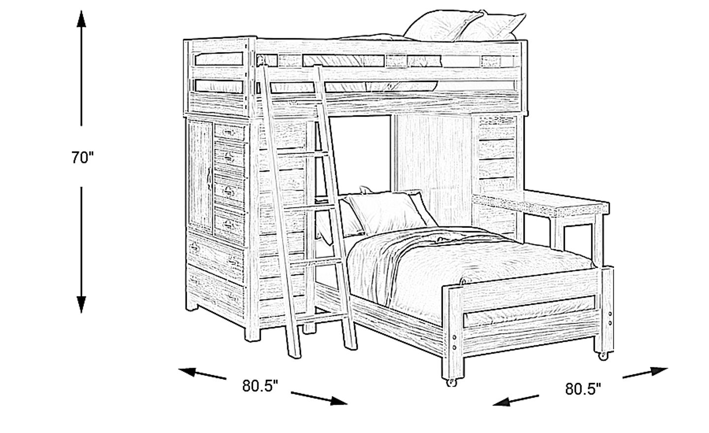 The Creekside twin/twin loft offers a wonderful combination of rustic charm and space saving design. One side of the twin loft has a storage chest with six drawers and concealed shelf space, the other side has the same dresser with an added desk attachment. A twin loft on casters is tucked underneath. All components are crafted of pine solids and veneers with a delightful charcoal finish. Mattresses and foundations (if required) sold separately. Bunkies required for mattress support.