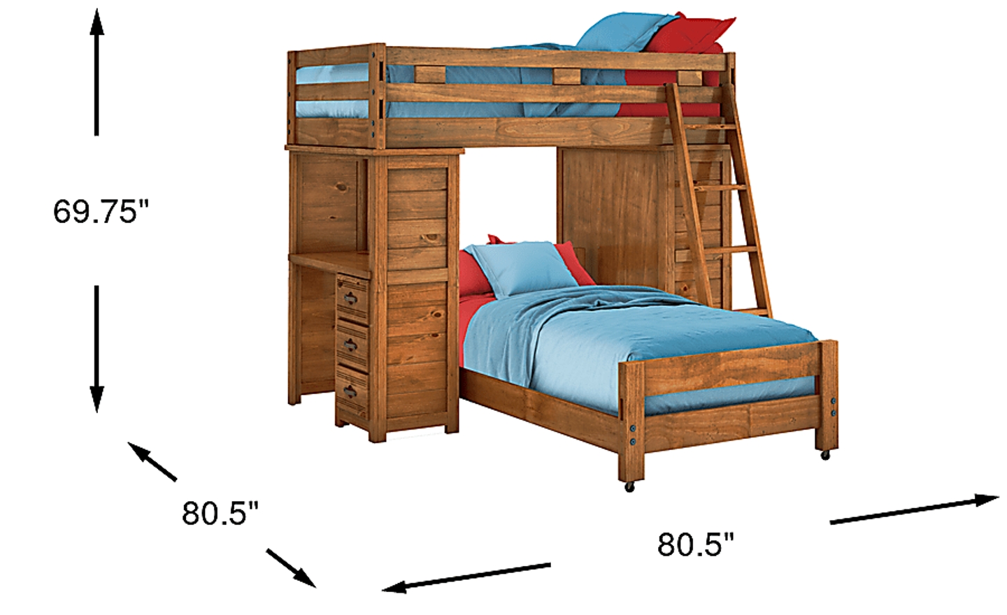 Clever and charming styling makes the Creekside twin/twin bunk a winning choice for your child's bedroom. At one end you'll find a built-in desk perfect for homework; the other end is completed by a full height chest with six drawers and a cabinet to meet all their storage needs. The bottom bunk can accommodate an optional trundle storage drawer, sold separately. Crafted with pine solids and veneers, the chestnut finish adds wonderful visual appeal. Mattresses and foundations (if required) sold separately. Bunkie Boards required for mattress support.