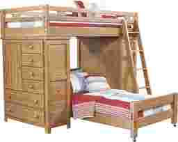 With the Creekside twin/twin loft you gain not only two twin beds, but double storage chests too! This configuration offers a six drawer chest, and a door that conceals shelf space, on each side of the twin loft. The twin bed below is on casters so that it can be easily moved if desired. Everything you see here is made from quality pine solids with a taffy finish. A sturdy ladder is included. Mattresses and foundations (if required) sold separately. Bunkies required for mattress support. Desk chair not available.