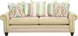 Create a relaxed environment with the casual Crescent Beach sleeper. It has an inviting look worthy of any coastal resort. The sofa is upholstered in natural cotton fabric in a neutral tan tone. Long reversible boxed seat cushions provide comfortable seating for two or more. A decorative array of loose pillows in a mix of stripes and patterns offer eye appealing back support. Pleated rolled arms and wood legs provide the final touch. When it's time for overnight guests the queen size Sealy Royale mattress, with its quilted top, offers an easy solution. Crescent Beach Dune Sleeper100% Cotton