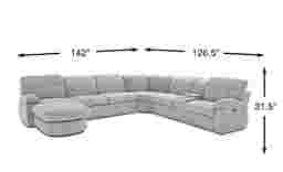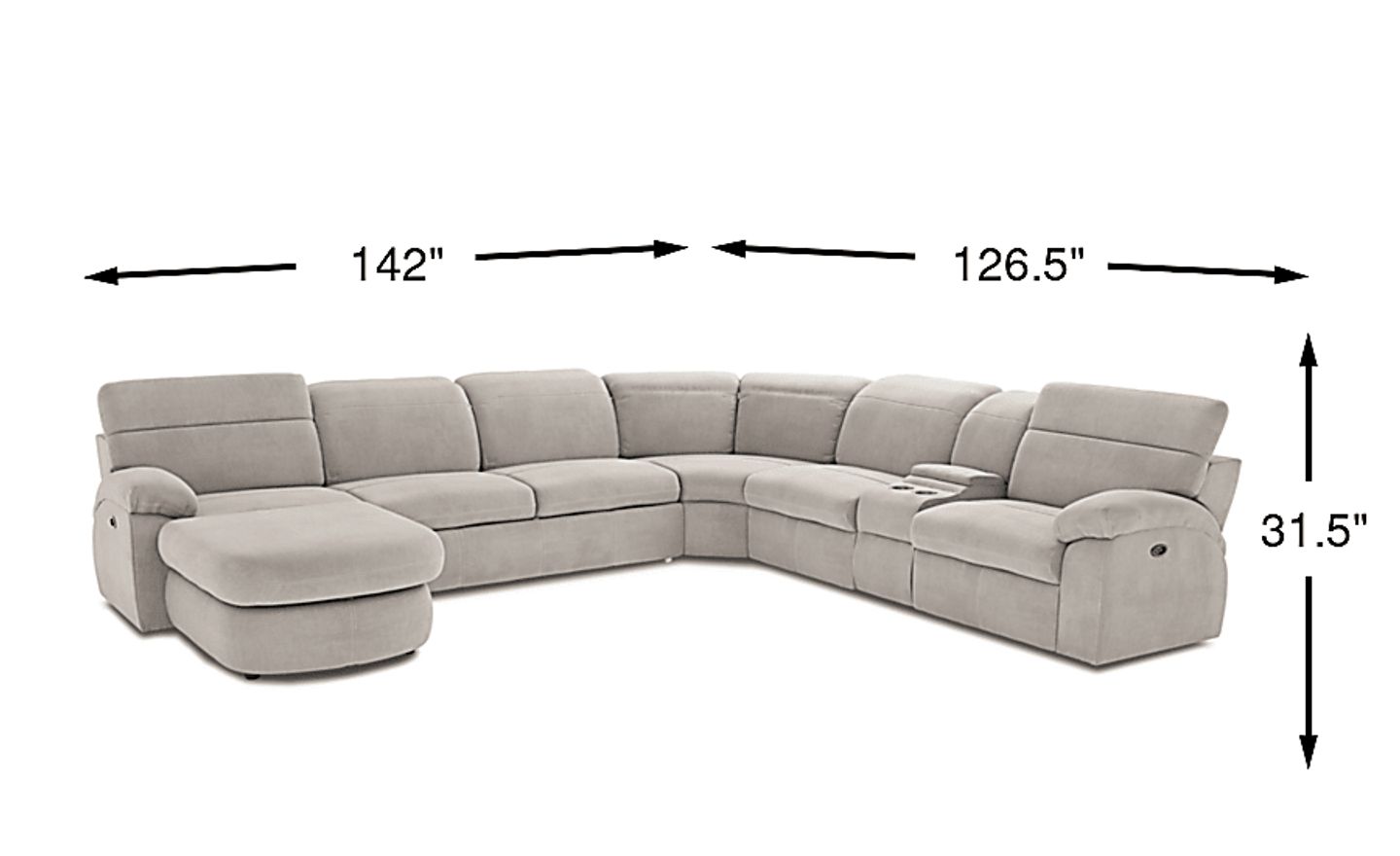 Packed with special features, the spacious Crescent Place power reclining sectional makes a stylish spot to relax and entertain. Upholstered in gray woven fabric, this sectional comfortably seats up to six people. Three of the chaise-style footrests recline at the touch of a button, allowing you and your guests to easily kick back. Perfect for stowing away blankets or pillows, the chaise opens to reveal hidden storage. A pop-up sleeper in the center conveniently accommodates overnight stays. Designed for customized comfort, the ratchet-style headrests are manually adjustable. Two cupholders and a lift-top compartment in the console offer space to keep drinks and other items close at hand. Contrast stitching adds a touch of detail, while padded pillowtop arms lend a plush feel. Upholstery: 100% Polyester
