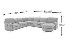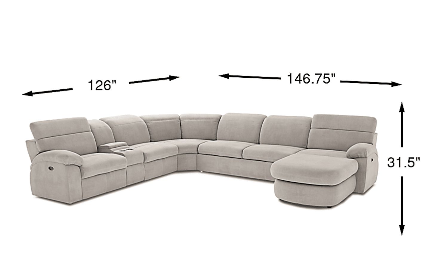 Packed with special features, the spacious Crescent Place power reclining sectional makes a stylish spot to relax and entertain. Upholstered in gray woven fabric, this sectional comfortably seats up to six people. Three of the chaise-style footrests recline at the touch of a button, allowing you and your guests to easily kick back. Perfect for stowing away blankets or pillows, the chaise opens to reveal hidden storage. A pop-up sleeper in the center conveniently accommodates overnight stays. Designed for customized comfort, the ratchet-style headrests are manually adjustable. Two cupholders and a lift-top compartment in the console offer space to keep drinks and other items close at hand. Contrast stitching adds a touch of detail, while padded pillowtop arms lend a plush feel. Upholstery: 100% Polyester