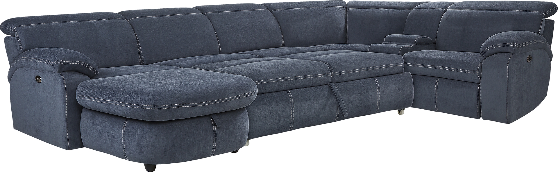 Packed with special features, the spacious Crescent Place power reclining sectional makes a stylish spot to relax and entertain. Upholstered in navy woven fabric, this sectional comfortably seats up to five people. The footrest and power reclining chaise recline at the touch of a button, allowing you and your guests to easily kick back. Perfect for stowing away blankets or pillows, the chaise opens to reveal hidden storage. A pop-up sleeper in the center conveniently accommodates overnight stays. Designed for customized comfort, the ratchet-style headrests are manually adjustable. Two cupholders and a lift-top compartment in the console offer space to keep drinks and other items close at hand. Contrast stitching adds a touch of detail, while padded pillowtop arms lend a plush feel. Upholstery: 100% Polyester.