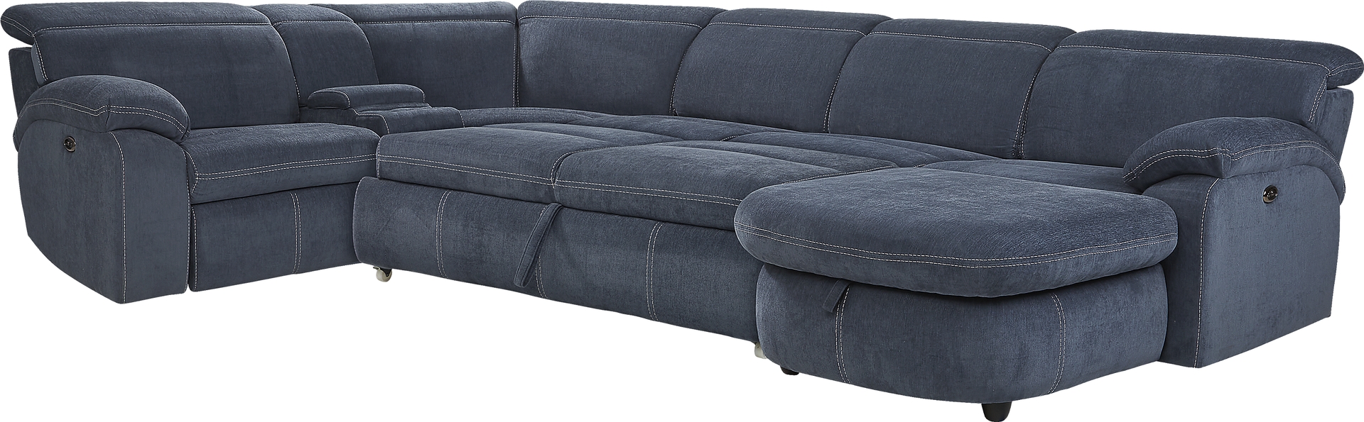 Packed with special features, the spacious Crescent Place power reclining sectional makes a stylish spot to relax and entertain. Upholstered in navy woven fabric, this sectional comfortably seats up to five people. The footrest and power reclining chaise recline at the touch of a button, allowing you and your guests to easily kick back. Perfect for stowing away blankets or pillows, the chaise opens to reveal hidden storage. A pop-up sleeper in the center conveniently accommodates overnight stays. Designed for customized comfort, the ratchet-style headrests are manually adjustable. Two cupholders and a lift-top compartment in the console offer space to keep drinks and other items close at hand. Contrast stitching adds a touch of detail, while padded pillowtop arms lend a plush feel. Upholstery: 100% Polyester.