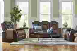 Upgrade your living space with the incredible comfort and casual contemporary style of the Crestline collection. Designed with lounging in mind, this cozy collection is upholstered in brown padded MicroFiber fabric with a subtle embossed pattern and contrasting stitching detail. Touch activated dual power reclining chaise footrests and headrests on select pieces places customizable comfort at the tip of your fingertips. Bucket style seating adds sumptuous comfort to each piece, while a cup holder and storage in each armrest keeps all of your essentials close at hand. The star of this collection is the dual power reclining sofa, with a center seat back cushion that folds down to reveal a table top with two cupholders, two wireless charging pads and magazine storage. Upholstery: 69% Polyester, 31% Polyurethane. Cleaning Instructions: Use water based cleaning agents or foam. Accent pillows not included. Tables and lamps not as shown in room image.
