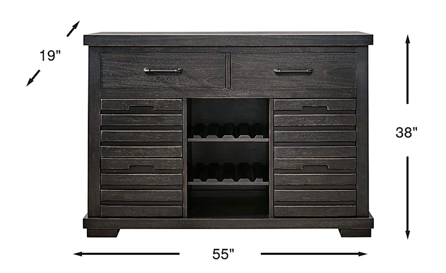 This server is built for versatility and organization. It features three open shelves that serve as a built-in wine rack or a display area for decorative items. To keep your dining essentials tucked away, it includes eight drawers, offering ample space for linens, specialized silverware, and serving accessories. The black metal pulls provide a sleek, modern touch for easy access to your items.