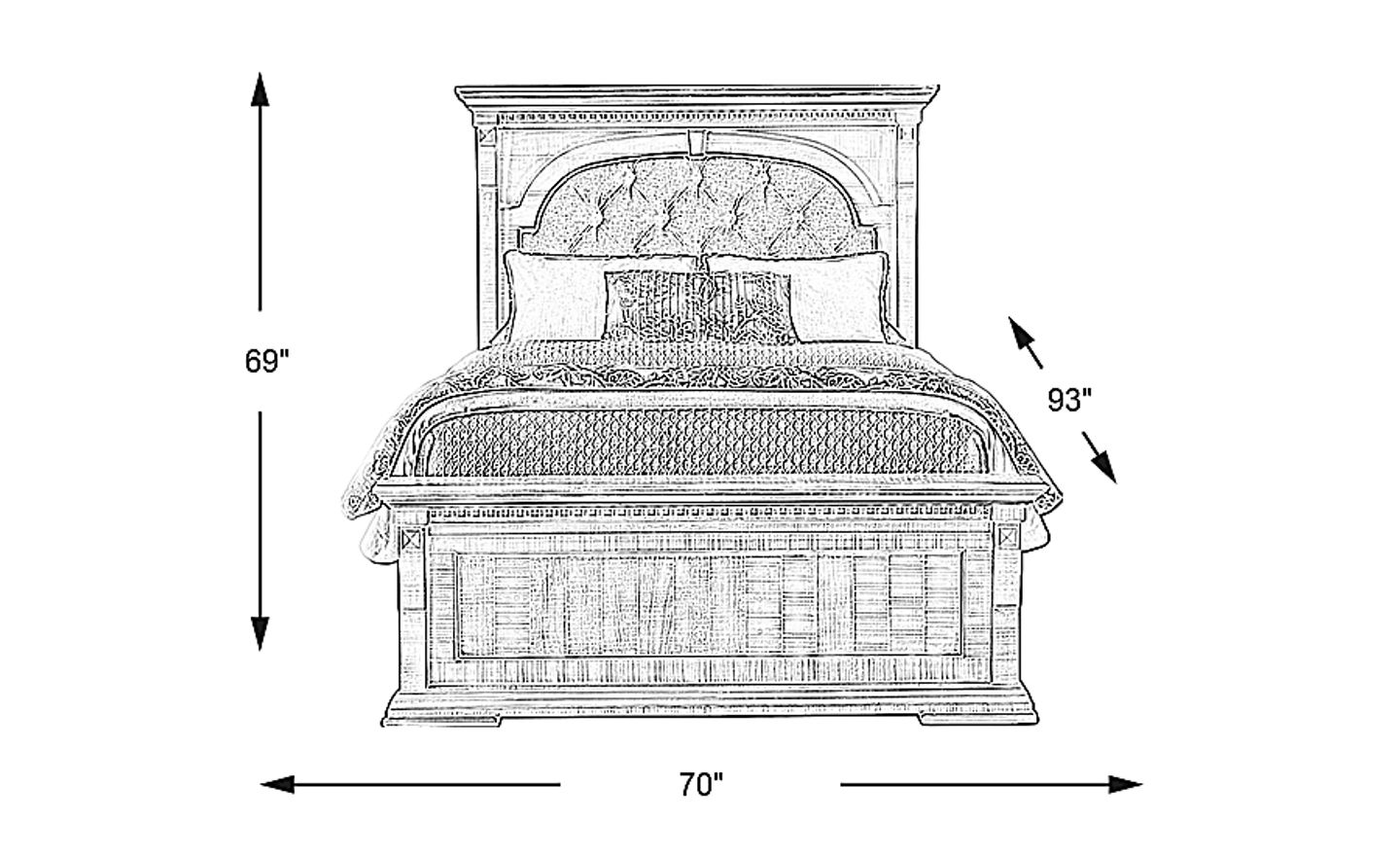 With dimensions of 93"L x 70"W, this bed is a substantial piece that provides an anchor for the room. To ensure a comfortable flow in your space, we recommend measuring to allow for at least 24 to 30 inches of walk-around clearance on either side. Its distressed white finish is particularly effective in smaller or darker rooms, as it helps reflect light and creates a more open, airy feel.