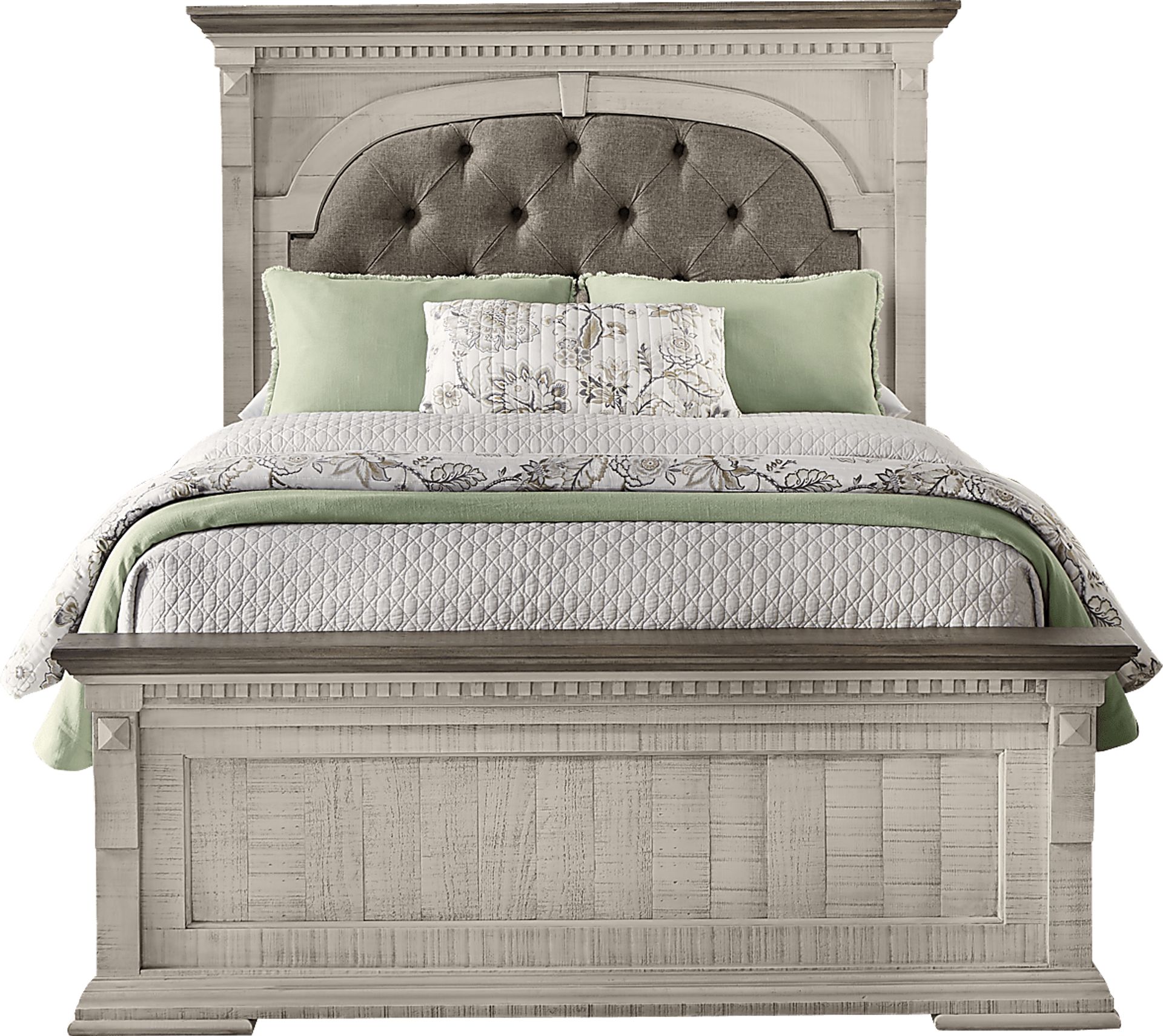 Distressed white finish and ornate detailing add a sense of old world grandeur to the Crestwell queen bed, delivering the robustness of rustic furniture at its finest. The footboard slat features paneled accents while the headboard slat's raised detailing frames tufted upholstery. Both boards are anchored by top rails in a rich, earthy iron gray.
