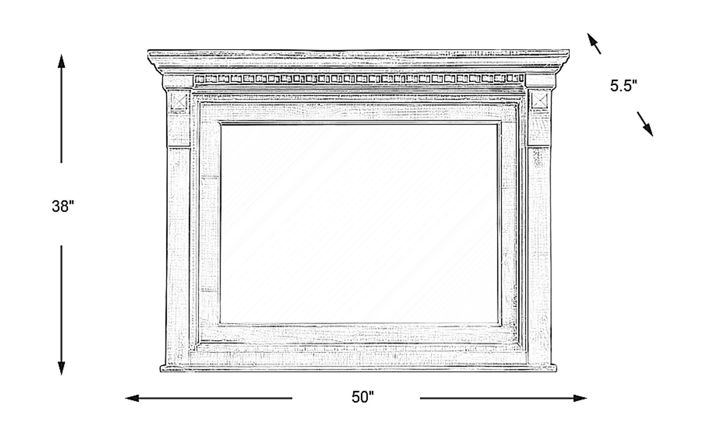 This mirror measures 50"W x 5.5"D x 38"H. A helpful rule of thumb is to select a mirror that is approximately two-thirds the width of the dresser itself to maintain proper visual proportions. With a substantial 50-inch width, this mirror provides a grand, authoritative presence that works exceptionally well on larger dresser units, adding both height and architectural interest to the room.