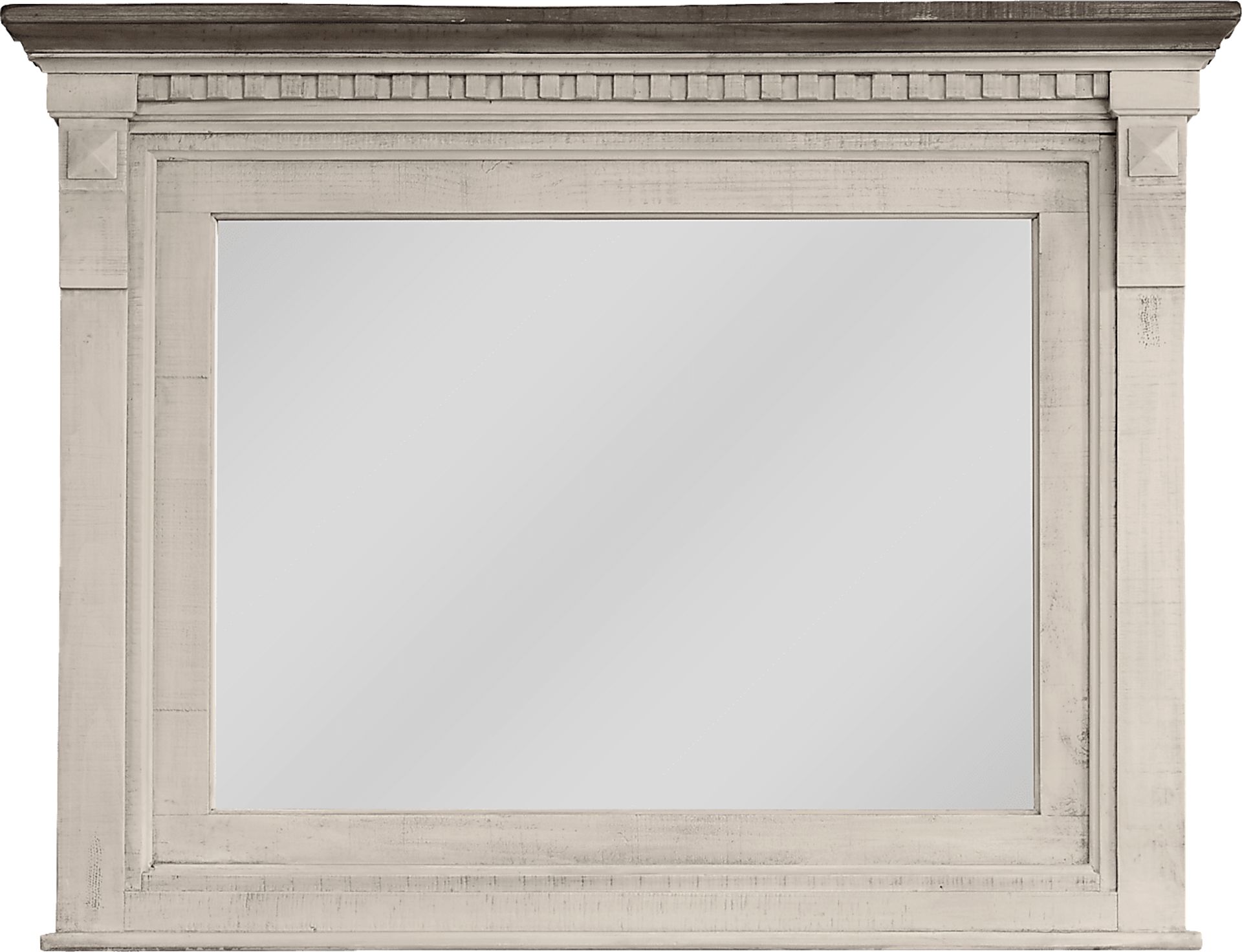 Distressed white finish and ornate detailing add old world grandeur to the Crestwell mirror. Adding a sense of depth and space, its matching detailing and top rail completes the set's look with a powerful vertical element.
