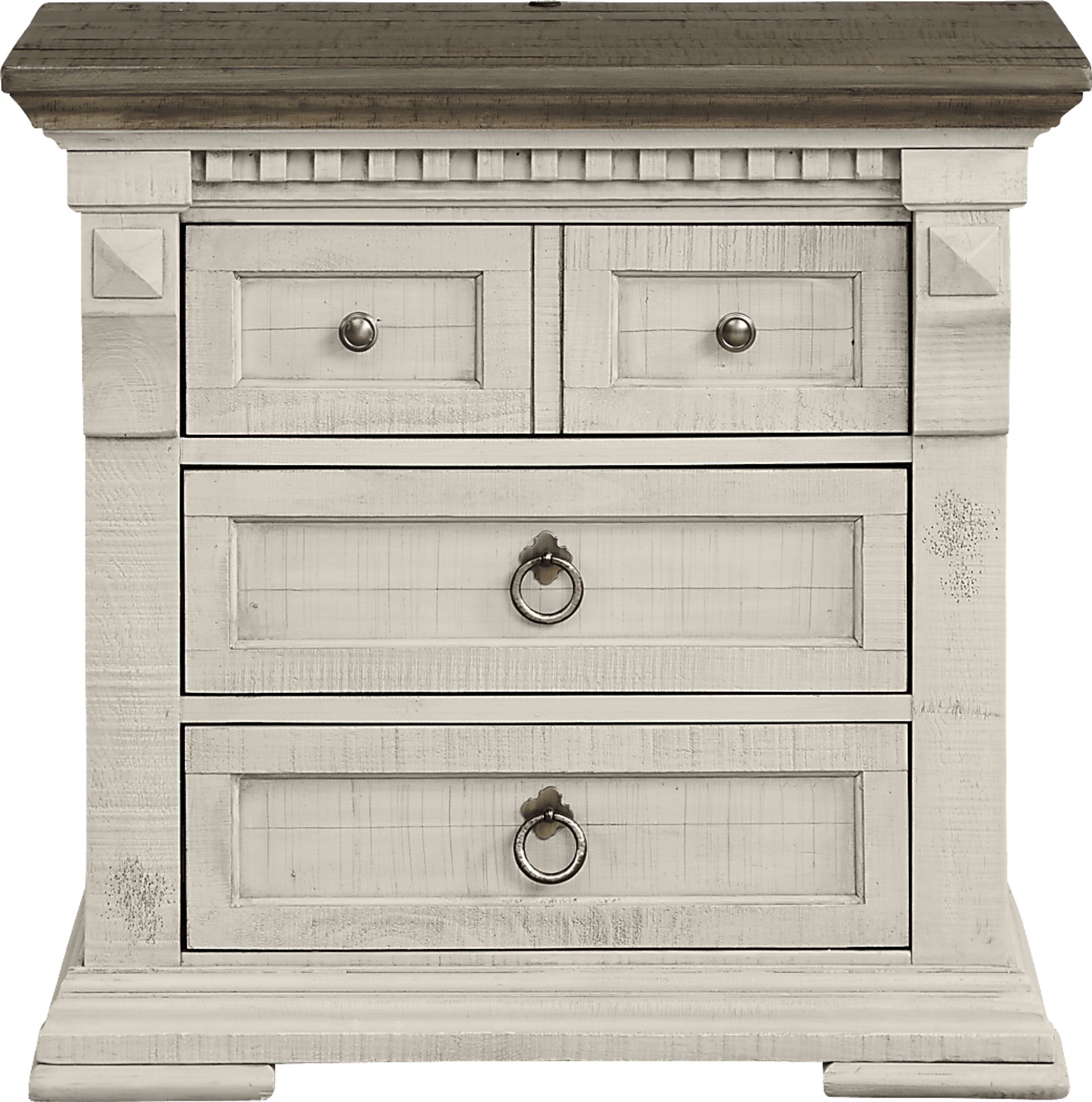 Distressed white finish and ornate detailing add a sense of old world grandeur to the Crestwell nightstand. Boasting felt lined top drawers, it features Zamak pulls and English dovetails with full extension side mount metal glides that add both an iron age feel with modern comforts. The iron gray top adds the final dramatic touch.