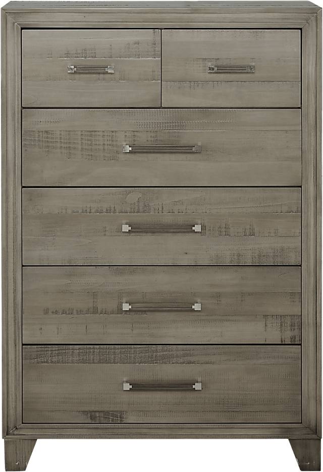 An ideal place to store your wardrobe, the Crestwood Creek chest is a stylish addition to your bedroom. Six drawers, including two felt-lined upper drawers, have English dovetail drawer construction for stability and feature satin nickel finished hardware. Constructed from pine solids and pine veneers, a brushed stone gray finish features light distressing for added dimension.