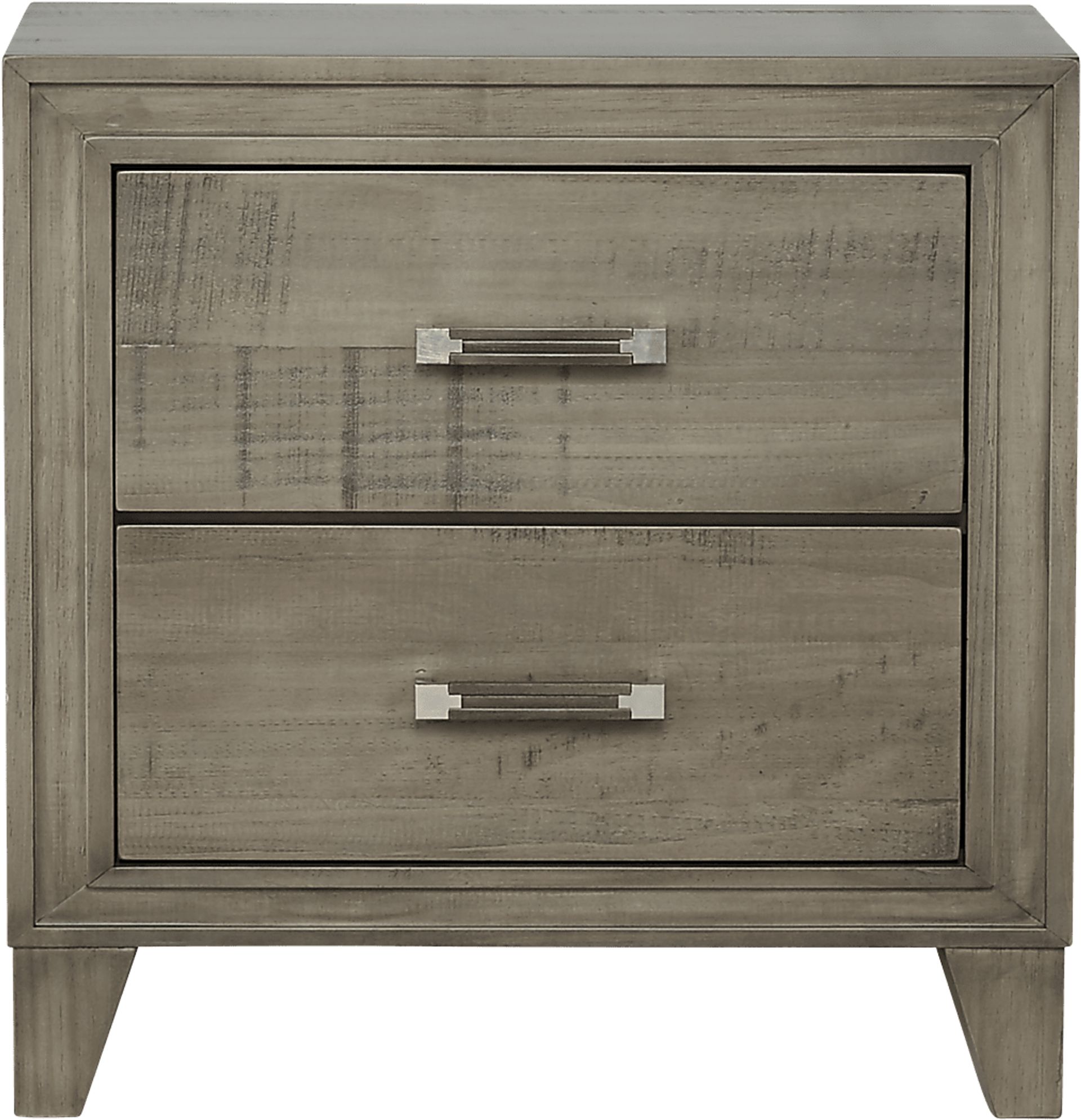Gain valuable bedside storage with the handy Crestwood Creek nightstand. Two drawers, including one upper felt-lined drawer, make this nightstand perfect for storing delicate items or a book nearby. Constructed from pine solids and pine veneers with a brushed stone gray finish, subtle distressing along the drawer fronts add an enduringly stylish urban-meets-rustic look. Chic satin nickel hardware accents the front of each drawer.