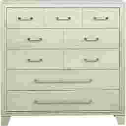 Crafted of pine solids and pine veneer with a distressed, wire brushed ivory white finish, the Crestwood Creek bureau offers ample space for all of your bedroom storage needs. Featuring five wide drawers, each utilizing sturdy English dovetail construction, this useful piece adds stylish practicality to your bedroom. Satin nickel finished hardware beautifully complements the urban rustic design.