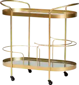 The frame is constructed from durable metal with a brushed gold finish, providing a high-strength foundation for the two tiers of glass. While designed to accommodate a standard collection of spirits and glassware, we recommend distributing heavier bottles evenly across the mirrored bottom shelf to maintain the structural integrity and balance of the contemporary design.