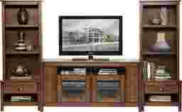 The Crown Valley wall unit boasts industrial casual styling and generous media storage. It's crafted of wood solids and veneers in a distressed cayenne brown finish. Distinctive antique style black metal brackets, antiqued bronze knobs and slatwork doors reinforce the vintage aesthetic. The center console measures 60 inches and includes open shelves for electronics with a ventilation grid and pass through hole for cord management. Beveled clear glass on the center doors open to twin shelves; additional adjustable shelves are located behind the wood doors. Side piers include abundant storage and display space including shelves and lower drawers. Crown Valley 5 Pc Wall Unit with 60 in. Console