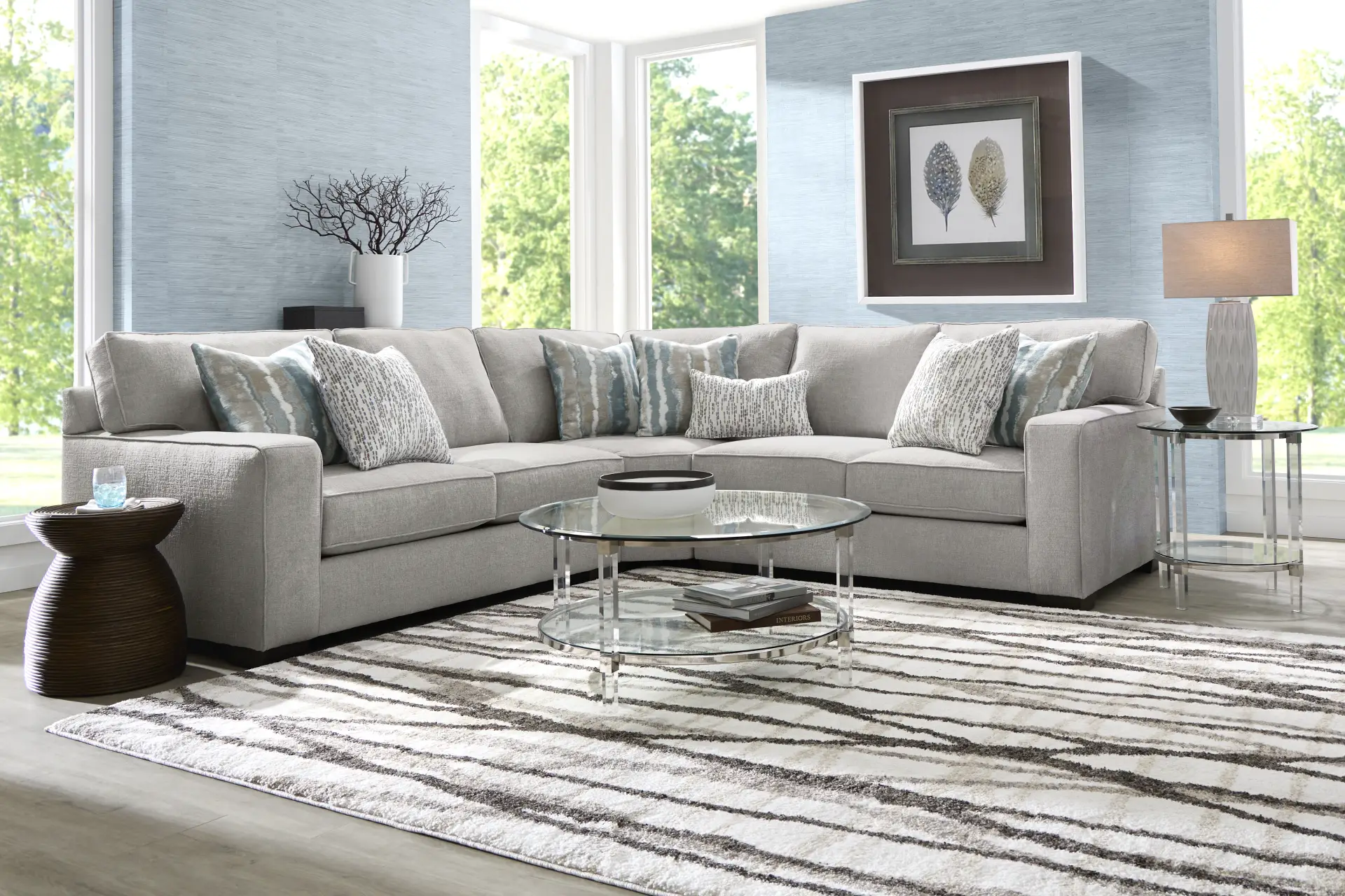 To create a grounded and professional look, a sectional of this size requires a substantial rug to avoid a "floating" appearance. We recommend a 10' x 14' or a 12' x 15' area rug. For the best visual balance, the rug should sit at least halfway under the front legs of all three pieces of the sectional and extend several inches beyond the arms. This ensures the entire seating arrangement feels like a single, cohesive zone.