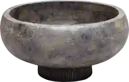 The Cyprel terracotta bowl is finished in an aged black with gold highlights and accented by a water hyacinth covered base.