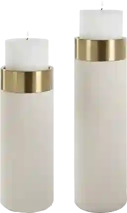 Cytta the set of two pillar candleholders are covered in a white faux shagreen with iron candle cups finished in antique brushed brass. Two, 4 x 3 white candles are included. Sizes S-4.63x13x4.63, L-4.63x16x4.63. Customer assembly is required.