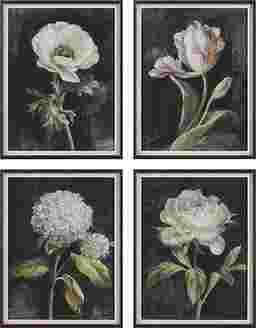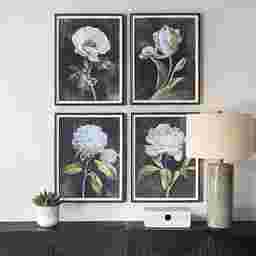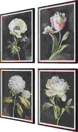 Accentuate your space with this assortment of traditional botanical Daiva prints. Each individual piece features a white flower with a hint of either dusty blue, lilac and rose pink, elegantly complemented by a rich, moody green leaf and stem. Petite, dark brown frames with a heavy mocha wash paired with gold plated inner lips. Each print is placed under a protective glass.