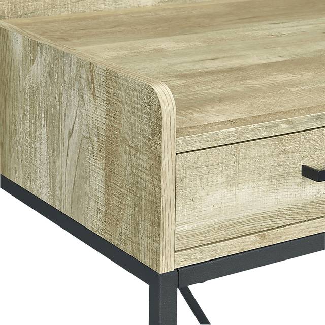 The Dalisa desk provides plenty of functionality and style. With one spacious drawer and two open storage compartments, the Dalisa provides ample storage for storing your favorite books. Constructed of sturdy wood and metal with a V-shaped back design. Black metal secure drawer pull adds textural element to this industrial desk. Includes one power outlet for keeping all of your devices charged. Features woodgrain detailing for a rustic finish. The vintage, industrial design is perfect for your home office or living room. Customer assembly is required.