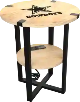 The Dallas Cowboys laser etched round side table features a modern design that seamlessly blends with various decorative styles. It offers a convenient functionality for charging up to four devices at one time. The 2-Tier shelf also provides ample space to store your TV remote and other small items. Whether you are a Cowboys fan or simply appreciate well-crafted furniture, this side table is a versatile addition to any room. Customer assembly is required.