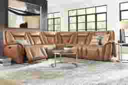 The luscious curves and opulent details of the Dalton sectional take luxurious living to its most heavenly extremes. This transitional collection showcases sumptuous top grain leather where the body touches in a warm camel color. Extra wide seats detailed with top-stitched seams and decorative quilting are surrounded by ultra plush cushions for exceptional support. On each padded armrest and back cushion welted seams add a subtle touch of elegance. Triple power reclining features zero-gravity adjustable headrests, footrests, and lumbar support for the ultimate in comfort, and each activator switch has convenient USB charging. Upholstery: Top grain leather where the body touches and polyurethane fabric sides and backs. Leather is a durable, low maintenance product, however, general regular maintenance is necessary. To keep your leather clean, vacuum it regularly, removing any dust, and clean it with water and a mild non-detergent soap.