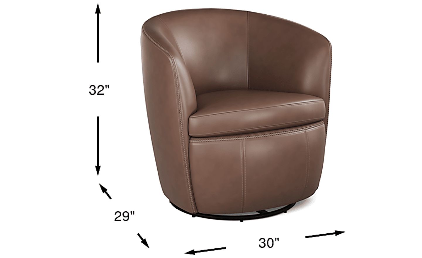 A tasteful and suave profile envelopes you in comfort when you sit in the Damascus swivel chair, an exquisite piece to engage, unwind, and elevate your living space with ease. Upholstered in deep brown top grain leather where the body touches, this modern accent chair showcases comfortable padded arms and a barrel shaped frame for an inviting embrace. The attached seat and back cushion provide sumptuous sink-in comfort, while the detailed top stitching adds character and a sophisticated touch. Its swivel feature brings effortless movement and allows you to be a part of every conversation in the room. Upholstery: Top grain leather where the body touches and vinyl sides and backs. Leather is a durable, low maintenance product; however, general regular maintenance is necessary. To keep your leather clean, vacuum it regularly, removing any dust, and clean it with water and a mild non-detergent soap.