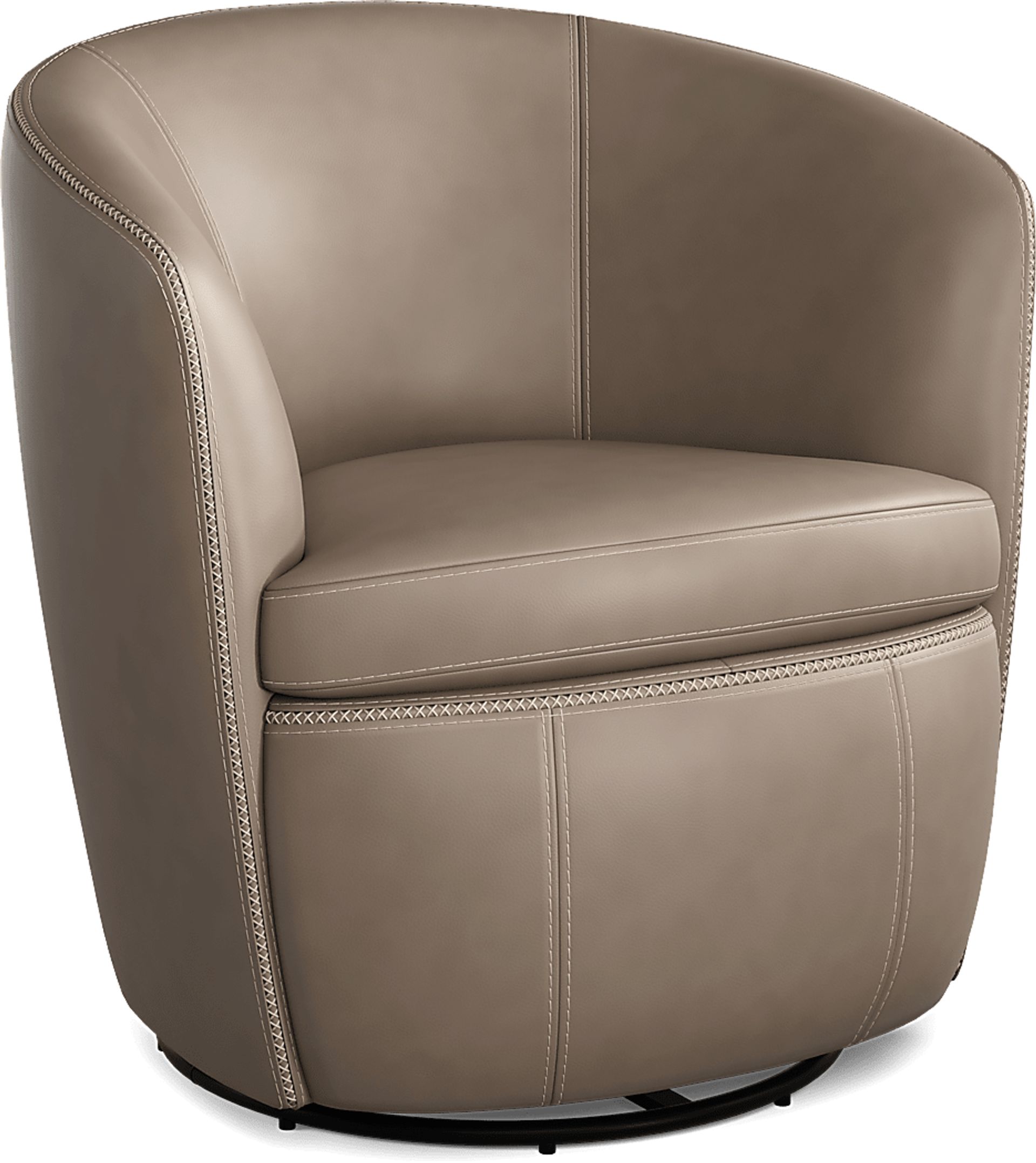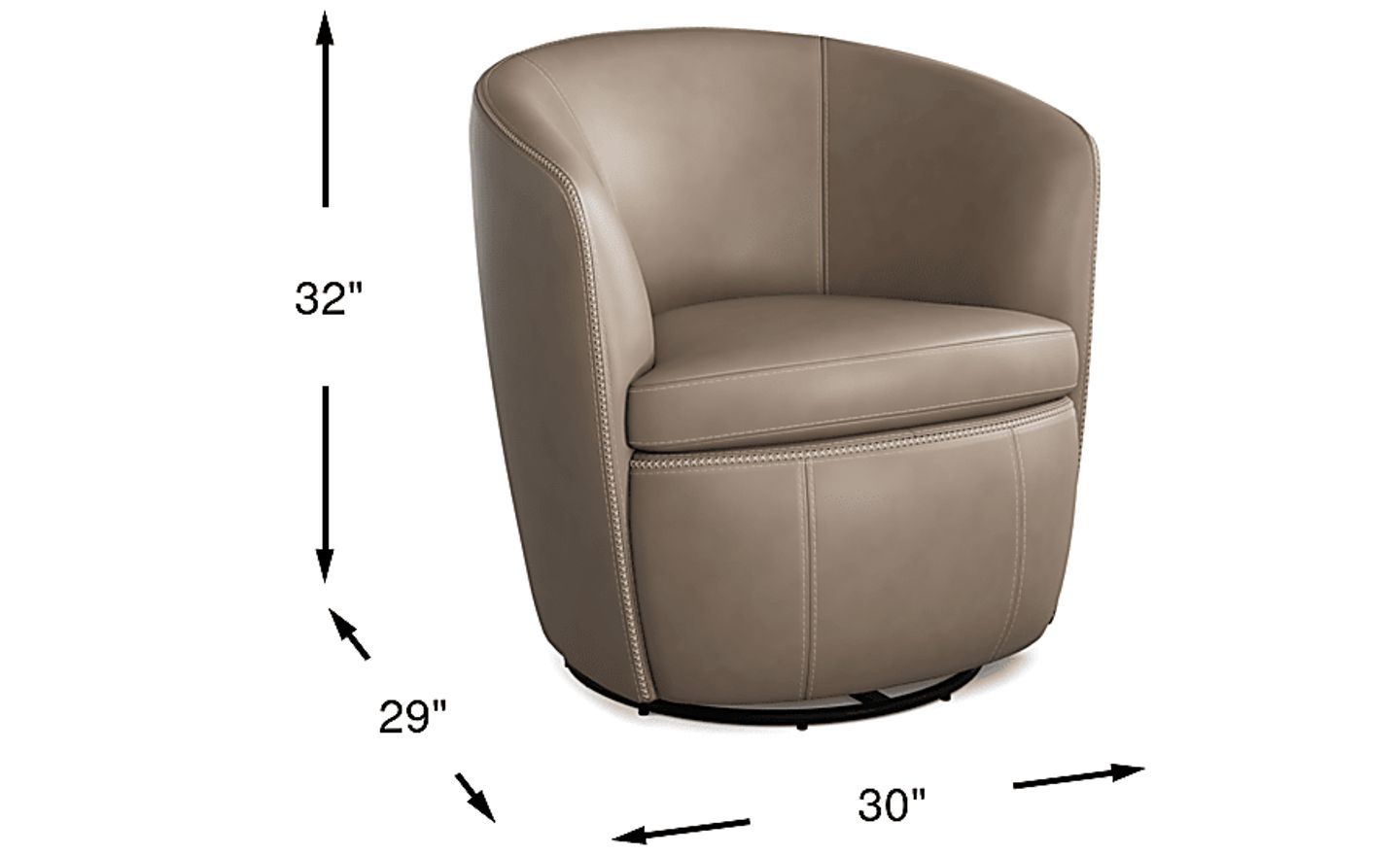 A tasteful and suave profile envelopes you in comfort when you sit in the Damascus swivel chair, an exquisite piece to engage, unwind, and elevate your living space with ease. Upholstered in stone gray top grain leather where the body touches, this modern accent chair showcases comfortable padded arms and a barrel shaped frame for an inviting embrace. The attached seat and back cushion provide sumptuous sink-in comfort, while the detailed top stitching adds character and a sophisticated touch. Its swivel feature brings effortless movement and allows you to be a part of every conversation in the room. Upholstery: Top grain leather where the body touches and vinyl sides and backs. Leather is a durable, low maintenance product; however, general regular maintenance is necessary. To keep your leather clean, vacuum it regularly, removing any dust, and clean it with water and a mild non-detergent soap.