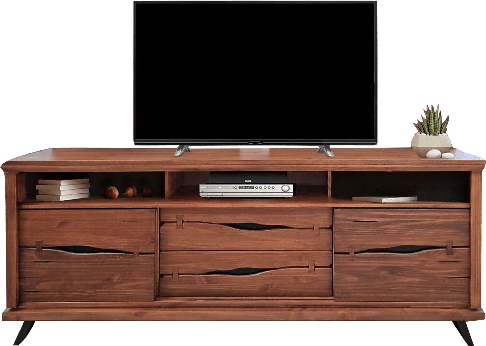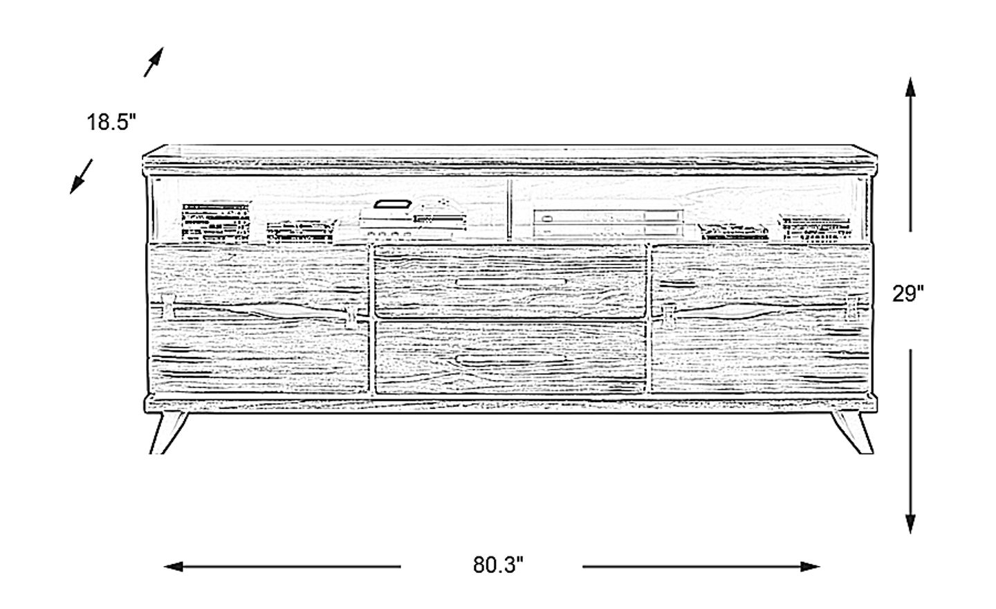 The Dana Point console offers rustic live edge style with plenty of media storage. The 80 inch surface is ideal for a flat screen TV while open shelves below (with pass through holes for wires) can accommodate a sound bar and more. Two spacious drawers provide storage for games and controllers. Behind each door is a shelf for organizing and storing additional items.