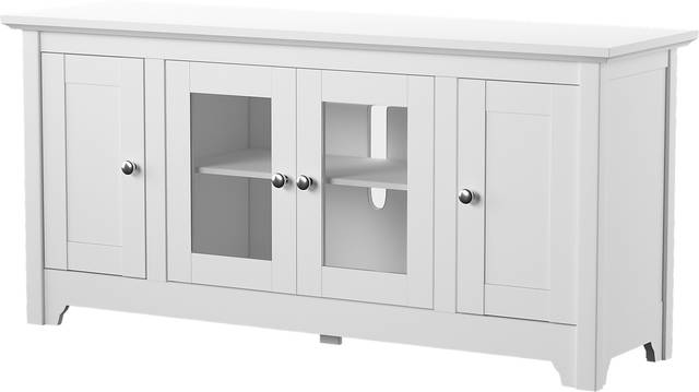 Built to support TVs up to 58 inches, this Danbyshire console is the perfect solution for your home entertainment. This entertainment center and TV stand features four media cabinets with adjustable shelving and a cable management system to fit your components more easily. Center cabinet doors have glass panes to make this storage console look even more classy. Crafted from warp-resistant MDF with wood veneer finish to fit your home decor for a transitional style you'll admire. Customer assembly is required.