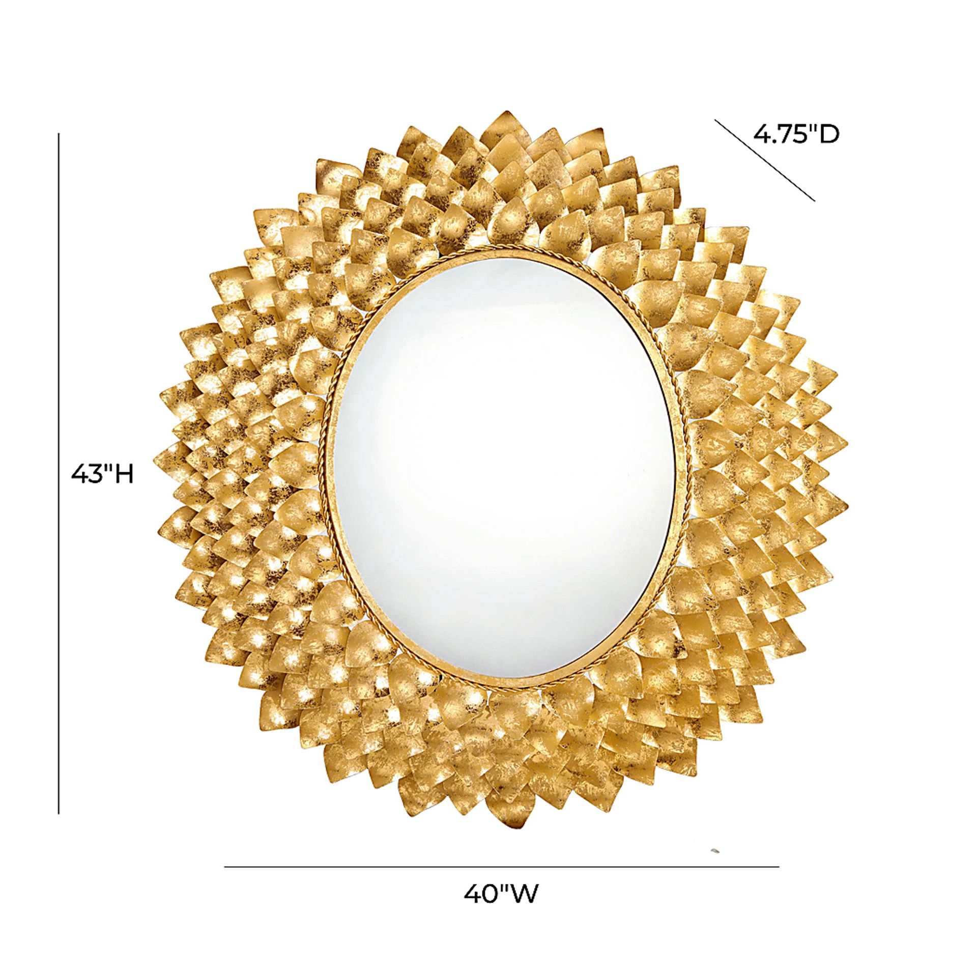 The Danela Faye mirror's exceptional hand hammered frame boasts a golden finish and will add a unique sculptural texture to any space. Customer assembly is required.