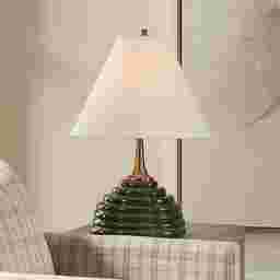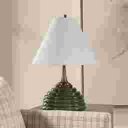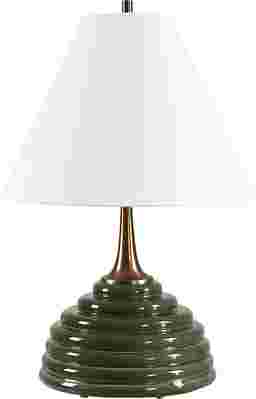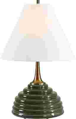 The Danie Green Lamp feels like a little moment of joy sculpted into light-its glossy, stacked-ring base glowing in a rich olive green that brings warmth, whimsy, and a touch of retro charm to any space. The brass neck rises like a delicate stem, adding a hint of sophistication that beautifully balances the playful silhouette below. Topped with a crisp white shade, it casts a soft, inviting glow that feels equal parts cozy and elevated, like the perfect finishing touch in a thoughtfully curated home. Let this charming, character-filled beauty be the one you bring into your home. Partial assembly may be required.